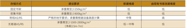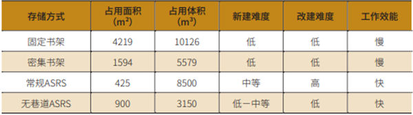 由此可見,新建常規(guī)AS/RS的難度要顯著高于其他幾種存儲方式。此外,受制于既定書庫凈高,利用現(xiàn)有庫房條件改造成常規(guī)AS/RS較為困難且不夠經(jīng)濟。因此,建設(shè)常規(guī)AS/RS應(yīng)當(dāng)在新館或新庫建筑設(shè)計前就已將規(guī)劃納入其中。