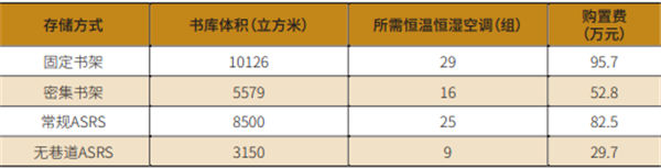 密集書架因其可在軌道上移動的特點,能夠在不使用時緊密排列,從而相較于固定書架大幅減少了所占用的面積。以上海圖書館為例,密集書架在1275m2、凈高3.5m的書庫面積內(nèi)可存儲約80萬冊圖書。因此,采用密集書架所需的書庫面積約為1594m2,所需體積為5579m3。