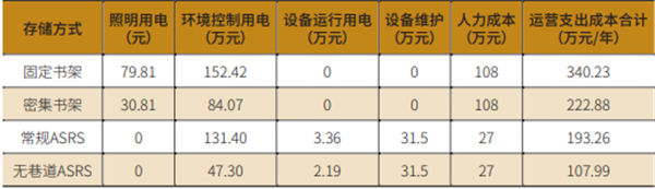 無巷道AS/RS設(shè)備用電為機器人以及服務(wù)器系統(tǒng)運營,根據(jù)設(shè)備供應(yīng)商估算,100萬冊藏書量的庫房一天需約耗電60度,即60/kW·h,故設(shè)備運行電力成本為:60/kW·h×1元/kW·h×365天=2.19萬元。