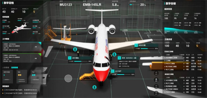4.維修機庫數(shù)字孿生:運用數(shù)字孿生技術(shù),對維修機庫進行數(shù)字化還原,實現(xiàn)物理機庫與虛擬機庫的實時同步。通過數(shù)字孿生機庫,可以實時查看飛機的維修進度、設(shè)備的運行狀態(tài)、人員的工作情況等信息。