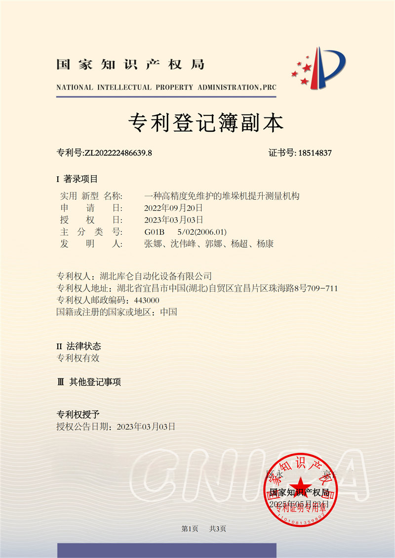 一種高精度免維護的堆垛機提升測量機構專利證書